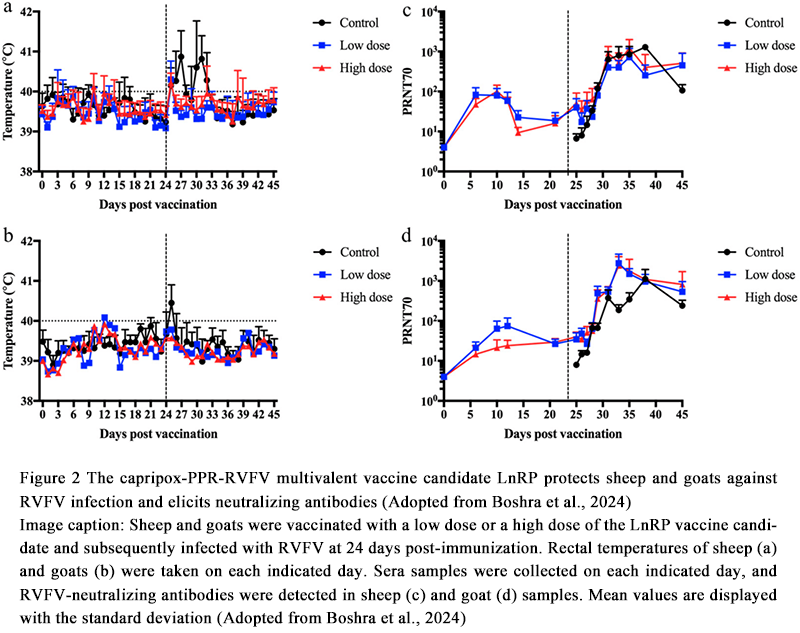 Figure 2 The capripox-PPR-RVFV multivalent vaccine candidate LnRP protects sheep and goats against RVFV infection and elicits neutralizing antibodies (Adopted from Boshra et al., 2024) Image caption: Sheep and goats were vaccinated with a low dose or a high dose of the LnRP vaccine candidate and subsequently infected with RVFV at 24 days post-immunization. Rectal temperatures of sheep (a) and goats (b) were taken on each indicated day. Sera samples were collected on each indicated day, and RVFV-neutralizing antibodies were detected in sheep (c) and goat (d) samples. Mean values are displayed with the standard deviation (Adopted from Boshra et al., 2024) |